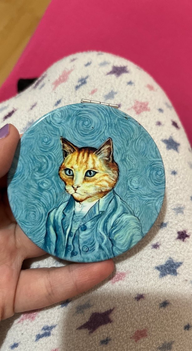 Pastel kahverengi kedi figürlü ayna, mavi takım elbise giymiş kedi resmiyle detaylandırılmış, elde rahat taşınabilir.