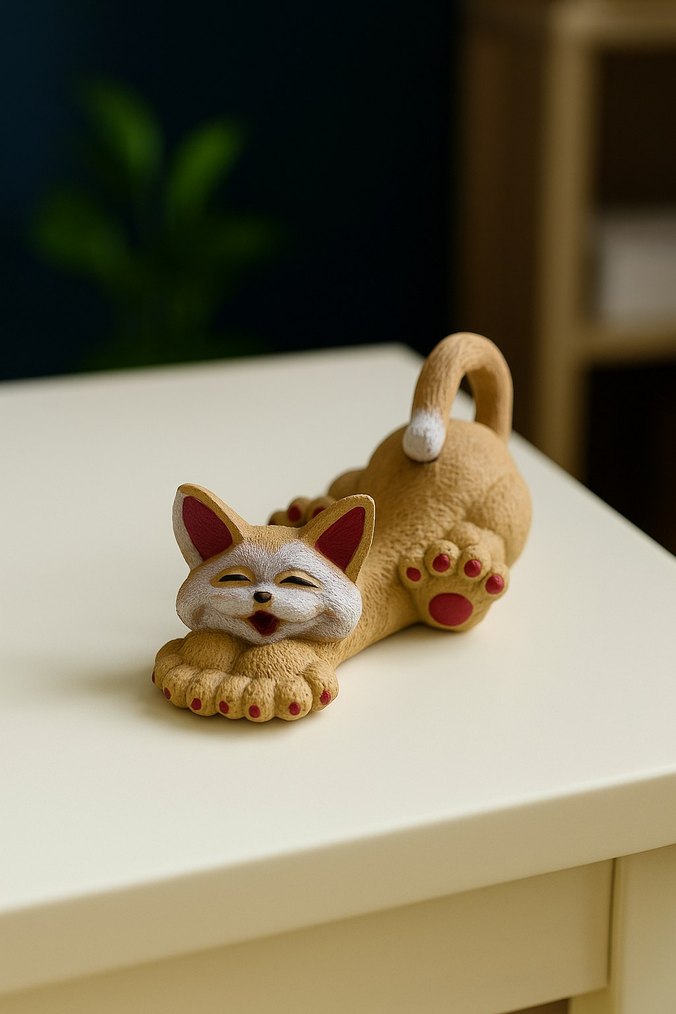 Pastel kahverengi, esneyen pozisyonda kedi figürü, detaylı patiler ve yüz ifadeleriyle dekor için uygundur.