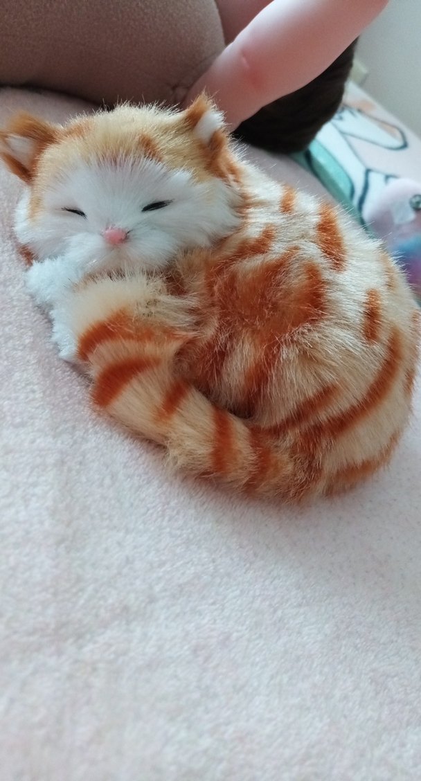 Pastel kahverengi, kıvrılmış pozisyonda yumuşak tüylü kedi peluş oyuncak. Ayrıntılı çizgileriyle gerçekçi ve sevimli görünüyor.