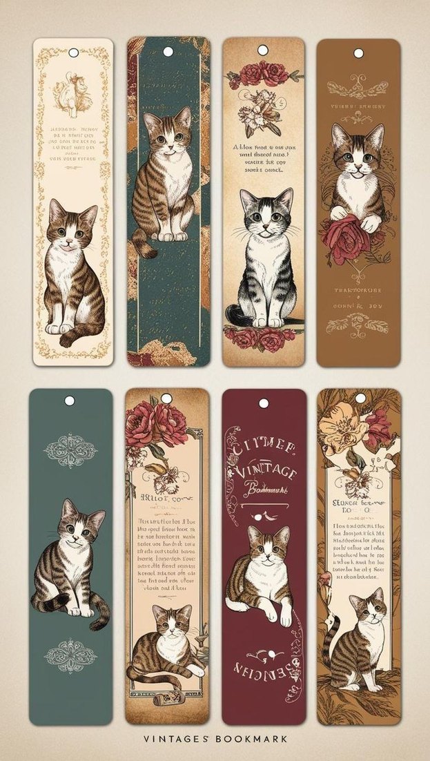 Pastel kahverengi tonlarda, vintage tarzda kedi ve çiçek desenli kitap ayraçları seti. Her ayraçta farklı kedi figürleri yer alır. tek tek de alabilirsiniz adet fiyatı 30 TL dir yorumlarda belirtiniz,