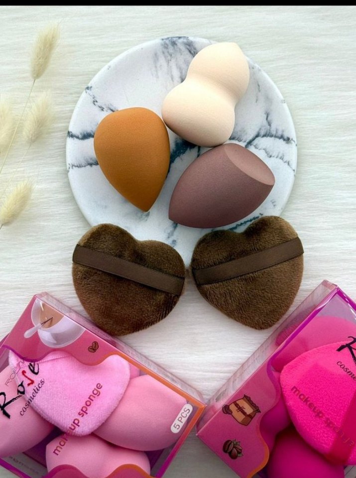 Pastel tonlarda kahverengi makyaj süngerleri seti, farklı şekillerde ve yumuşak dokuda, pürüzsüz uygulama için uygun.