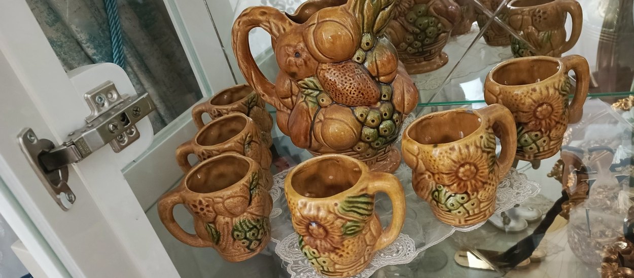 Pastel kahverengi tonlarında, detaylı meyve desenleriyle seramik sürahi ve kupa seti, nostaljik bir görünüm sunar.