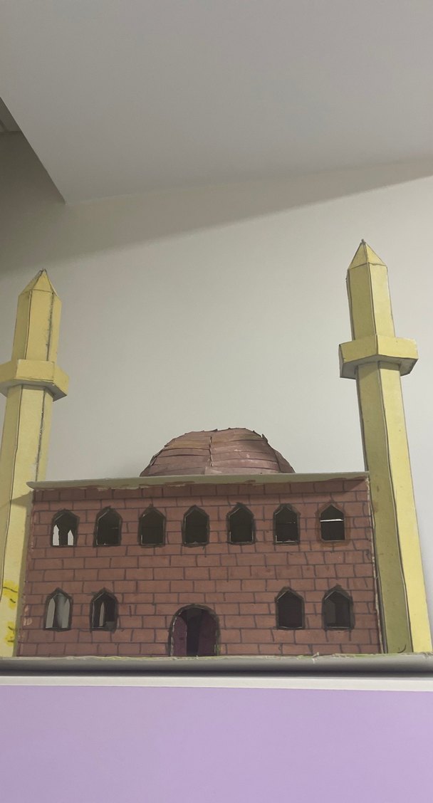 İki minaresi ve merkezde kubbesi olan pastel kahverengi maket, detaylı pencere ve kapı tasarımlarına sahiptir.