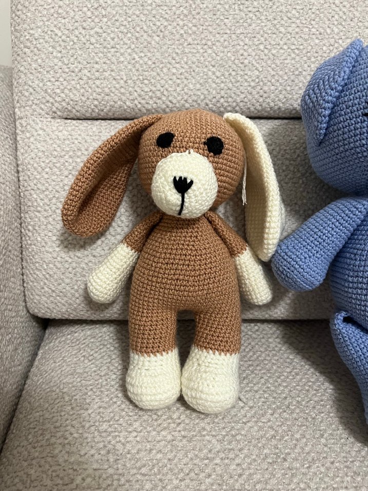 Pastel kahverengi örgü tavşan oyuncak, uzun sarkık kulaklar ve krem rengi patiler ile detaylandırılmış. Yumuşak ve el yapımı.