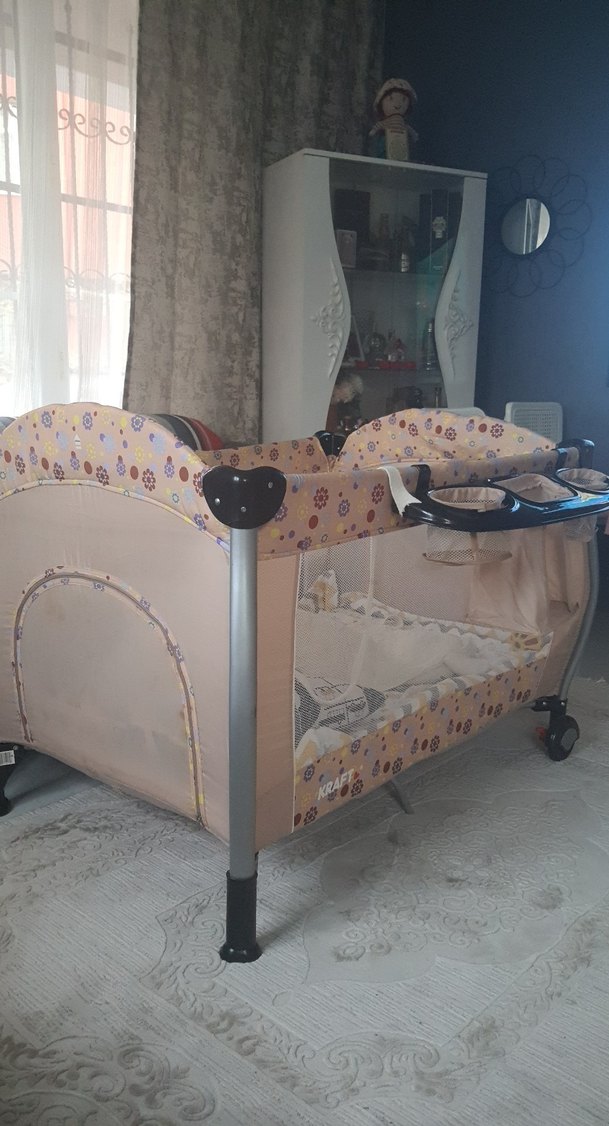 Havalandırma ve görünürlük için file yan yüzeylere sahip, yumuşak dolgulu çerçeveli ve tekerlekli pastel kahverengi oyun parkı yatak. ️