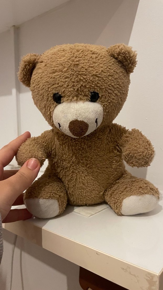 Yumuşak dokulu, pastel kahverengi peluş ayıcık, dikiş detaylarına sahip ve sarılmalık bir oyuncak.