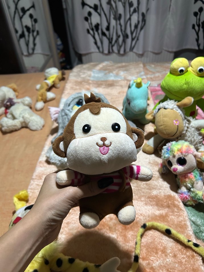 Pastel kahverengi peluş maymun oyuncak, yumuşak dokusu ve sevimli ifadesiyle oyun ve rahatlık sağlar.