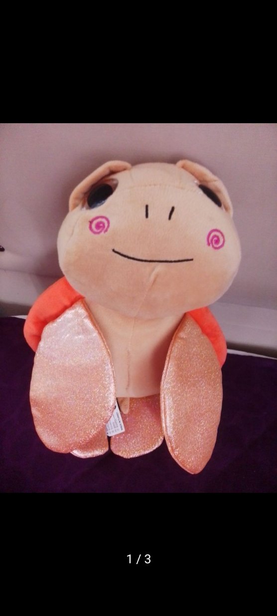 Yumuşak pastel kahverengi peluş oyuncak, parlak turuncu kanatları ve sevimli yüzü ile sarılmak için ideal.