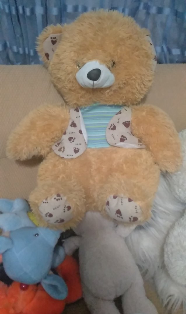 Bu peluş oyuncak ayı, yumuşak pastel kahverengi tüylere ve kulak, pati ve karın bölgesinde pati desenlerine sahiptir. Çizgili bir yelek giymektedir.