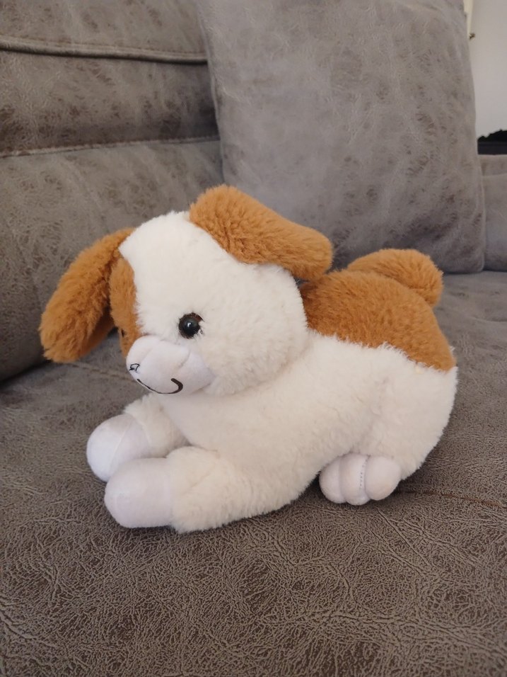 Yumuşak ve pastel kahverengi tonlarında, köpek şeklinde peluş oyuncak. Dekorasyon veya rahatlama için uygun. kalitelidir