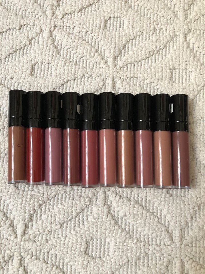 Koyu ve bej tonlarında, siyah kapaklı ruj seti. Doğal veya iddialı dudak makyajları için uygun. Pastel kalıcı likit ruj mat