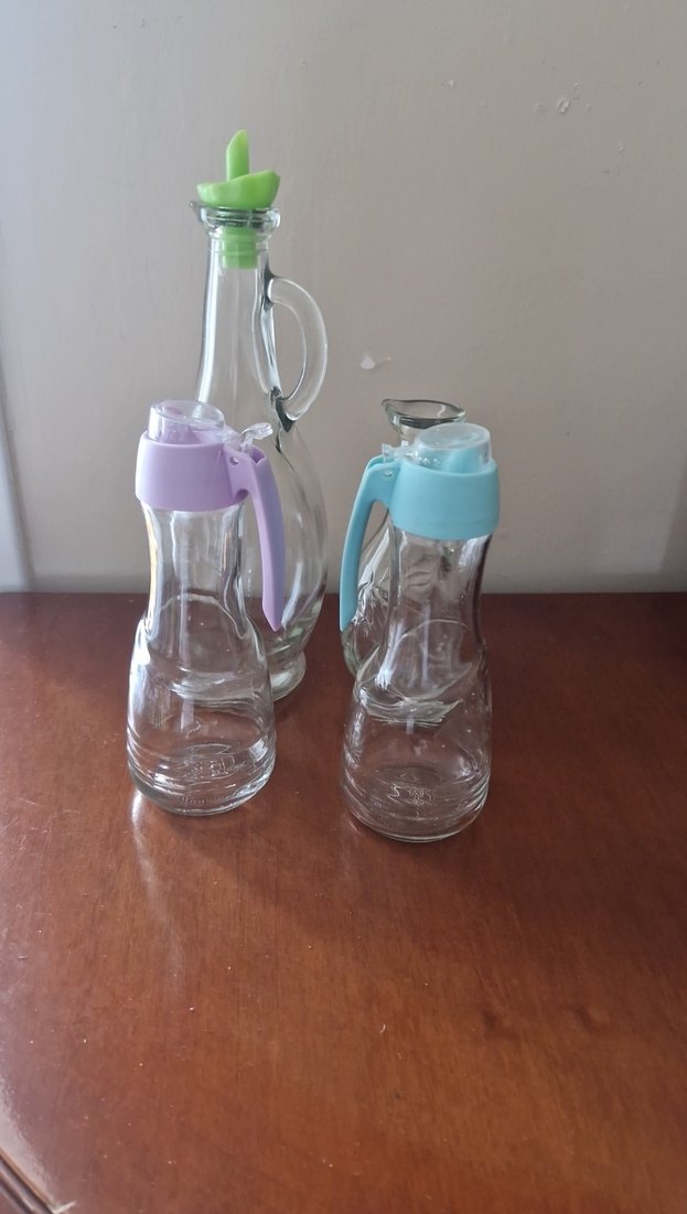 Pastel renkli kapakları ve kulpları ile cam yağlık ve sirkelik seti. Yeşil, mor ve mavi kapak seçenekleri bulunur.