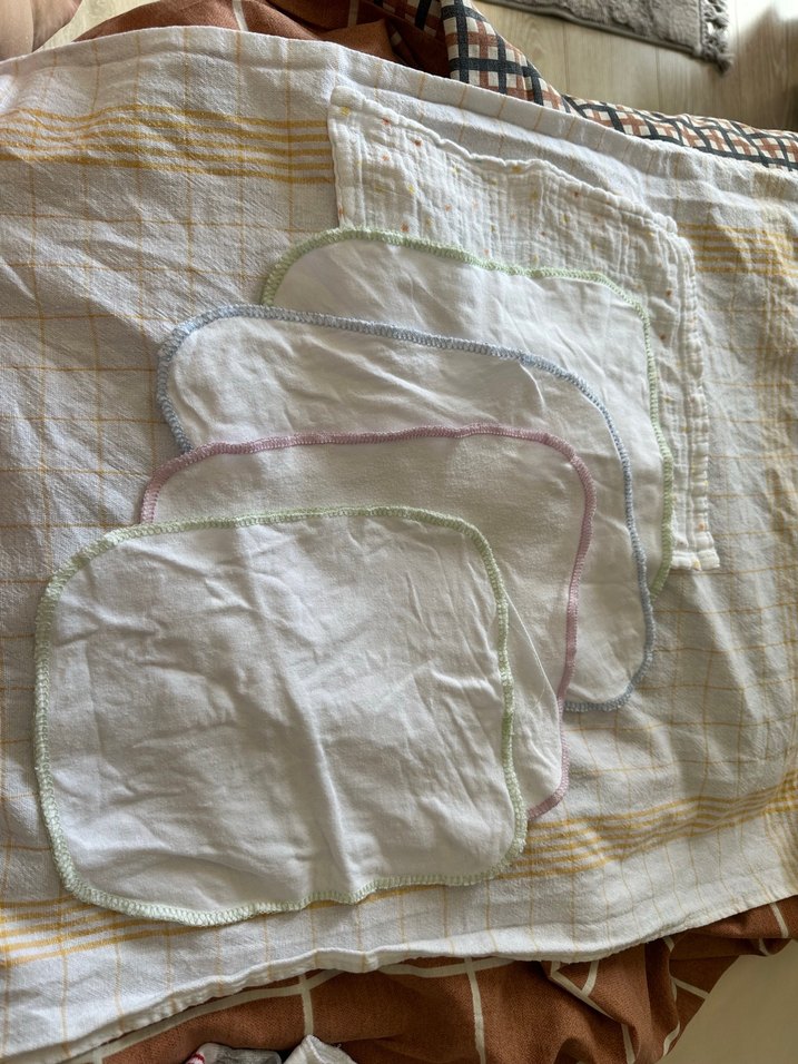 Pastel renkli kenarları olan beyaz, desensiz, yumuşak kumaştan bebek ağız mendilleri. 5 adet fiyatı