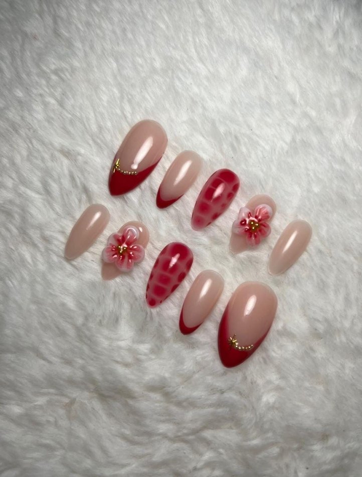 Pastel kırmızı tonlarda çiçek desenli ve küçük altın detaylı tırnak süslemeleri, zarif bir görünüm katar.