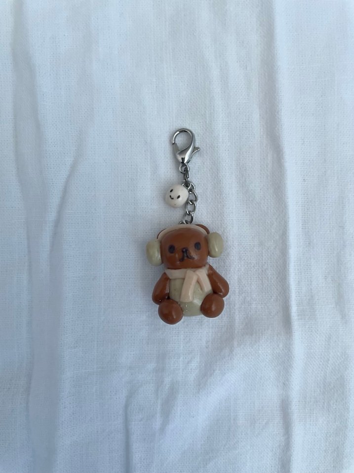 El yapımı polimer kil ayıcık figürlü anahtarlık. Yumuşak pastel tonu ve sade tasarımıyla sıcak, bohem bir hava katıyor.