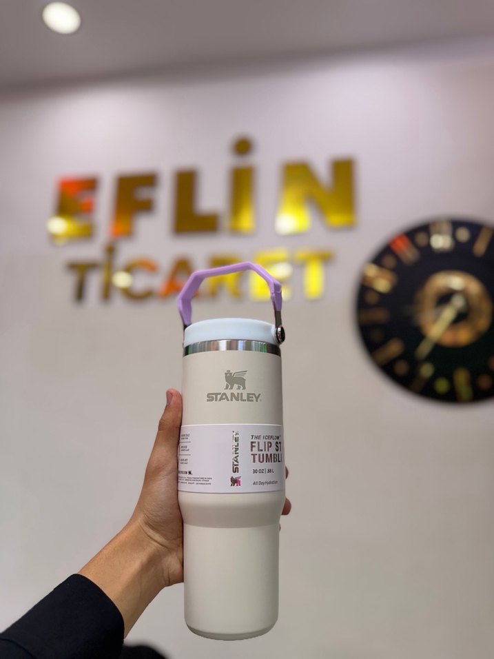 Pastel mor kulplu beyaz Stanley termos, içecekleri sıcak veya soğuk tutar. STANLEY logosu ve Flip Straw Tumbler etiketi bulunur.