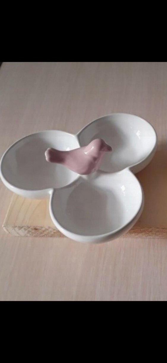 Modern beyaz tabak, üç bölmeli ve ortada pastel pembe kuş figürü bulunur. Atıştırmalıklar için uygundur. #çerezlik #reçellik #kurabiyelik gibi çok yönlü kullanılabilir elimde 2 adet var