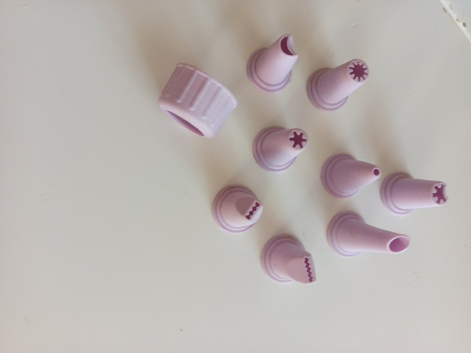 Pastel lila plastik malzemeden yapılmış çeşitli krema sıkma uçları içeren mutfak seti.