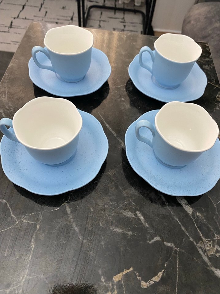 Pastel mavi renkte, zarif tasarımlı 4 adet fincan ve tabak seti. ☕