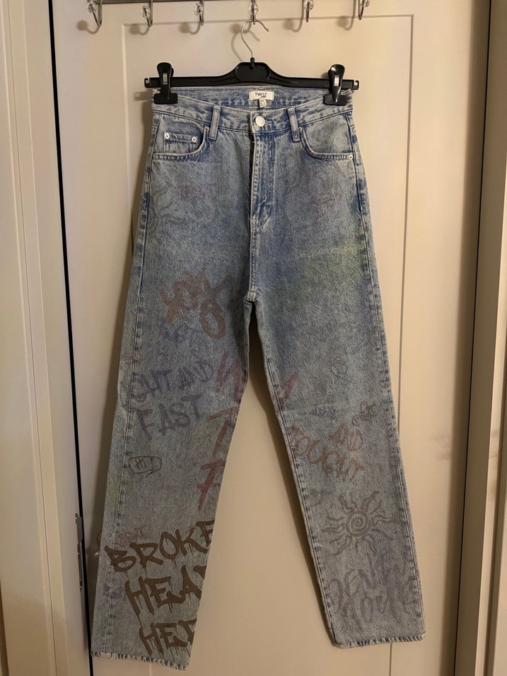 Pastel mavi renkte, bağlamalı detaylı ve bağcıklı, gevşek kesim midi boy denim pantolon. Yazılı grafik desenleriyle sokak tarzına uygun.