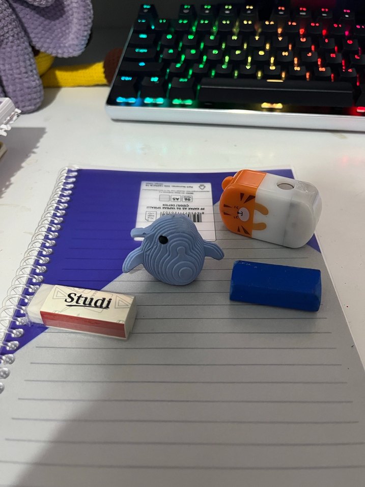 Pastel mavi balina şekilli silgi, mavi dikdörtgen silgi ve kedi şeklinde kalemtıraş içeren set, spiral defter üzerinde yer alıyor. 'Studi' yazısı bulunur.