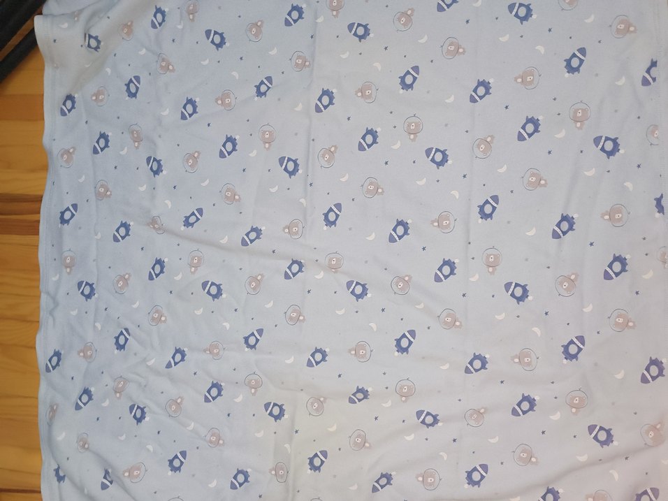 Pastel mavi renkte, baskılı desene sahip, yumuşak sentetik kumaştan çocuk battaniyesi.