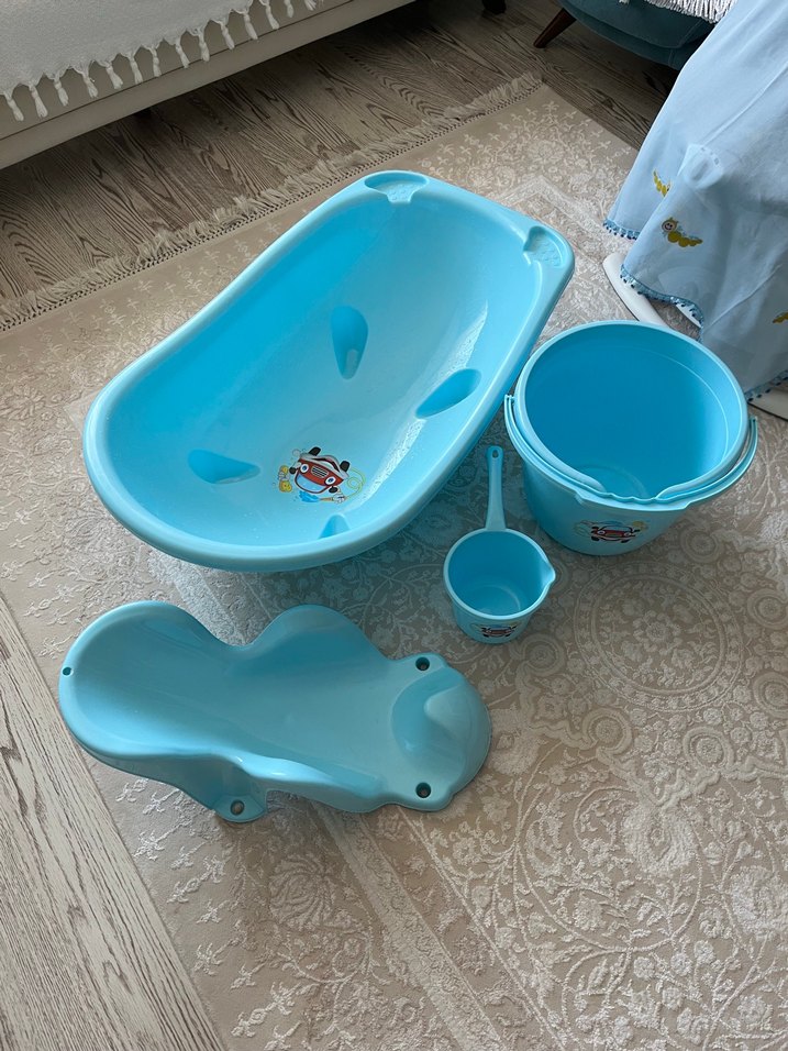 Pastel mavi renginde bebek küveti, oturak, iki kova ve küçük kepçe içeren banyo seti. Rahat ve güvenli kullanım sağlar.
