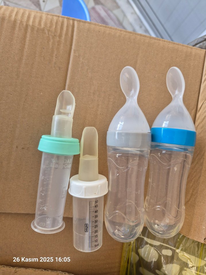 Pastel mavi renkli, yumuşak uçlu ve ölçü işaretli bebek biberon seti. Koruyucu kapaklı ve pürüzsüz tasarıma sahip. Tarih: 26 Kasım 2025. İstediğinizi yoruma yazın, konuşalım