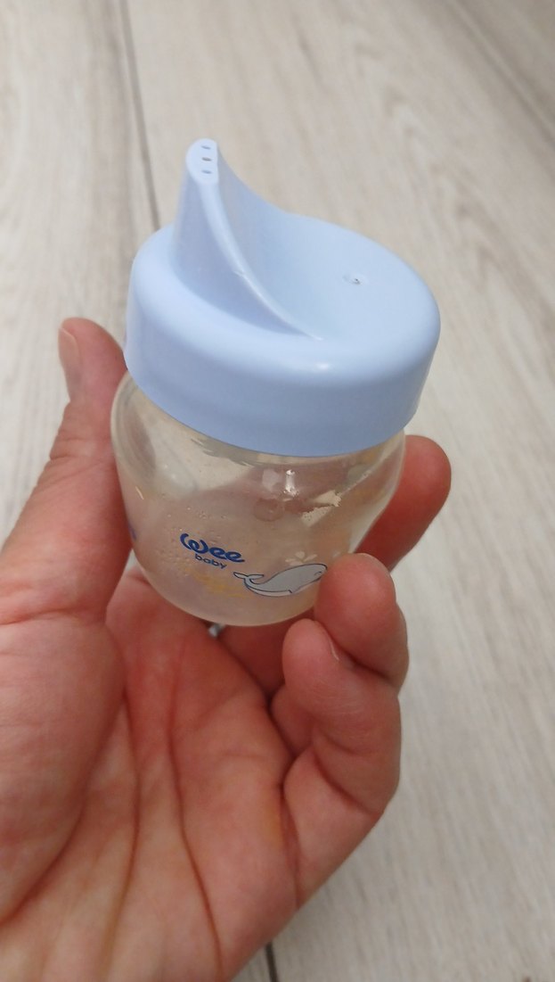 Pastel mavi kapaklı, şeffaf gövdeli bebek biberonu, kullanımı kolay ve hafif tasarıma sahiptir.