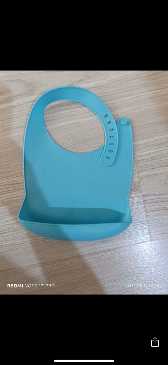 Pastel mavi renkte, ayarlanabilir boyun askısı ve döküntüleri tutan cep bulunan, kolay temizlenen yumuşak malzemeden yapılmış bebek önlüğü.
