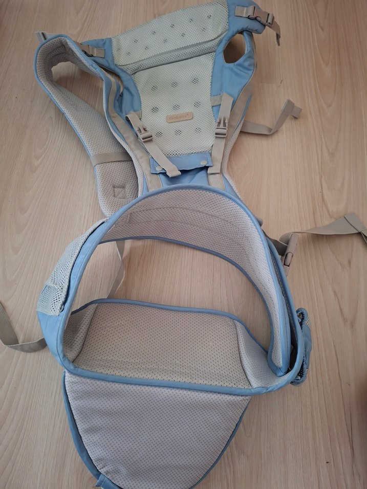 Nefes alabilen file kumaş ve ayarlanabilir kayışlara sahip pastel mavi bebek taşıyıcı.