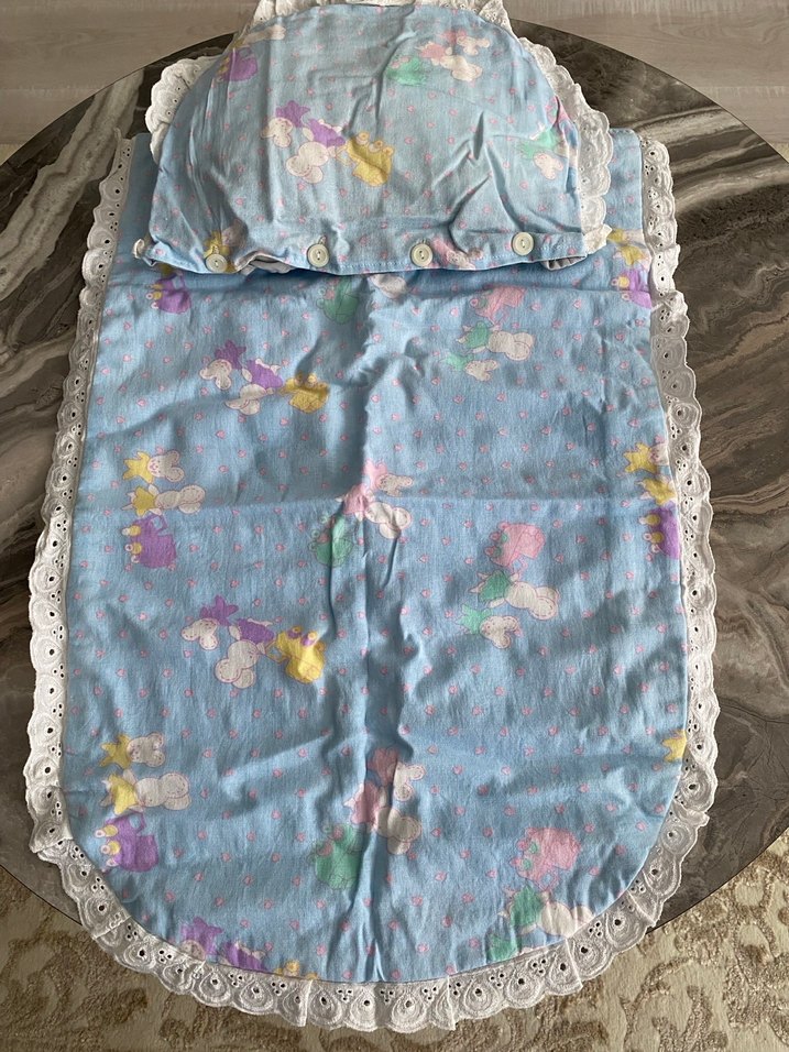 Pastel mavi renkte, yumuşak sentetik kumaştan yapılmış bebek uyku seti. Desenli ve dantelli, yastık ve uyku tulumu içerir.