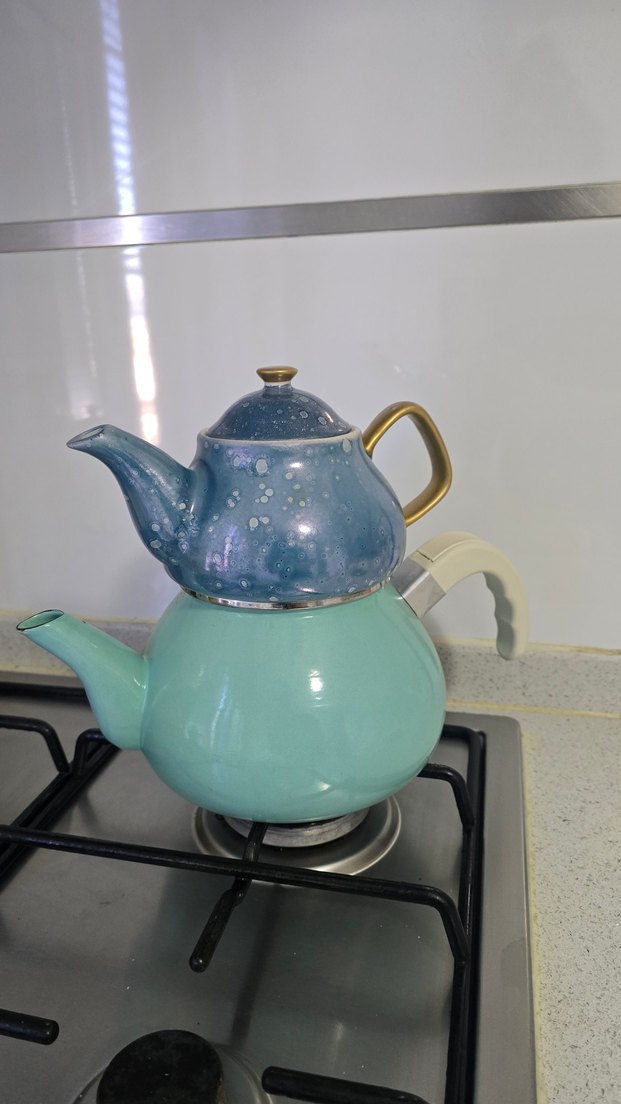 Pastel mavi renkli, üstte altın saplı küçük, altta beyaz saplı büyük çaydanlık seti. Çay demlemek ve servis etmek için kullanılır.