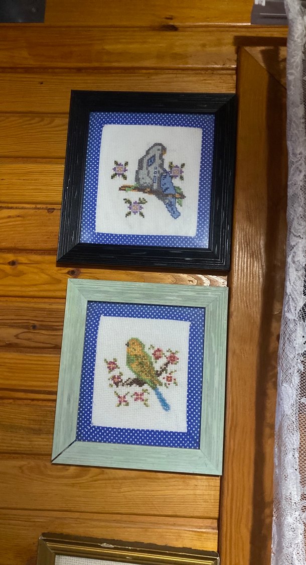 İki farklı çerçevede, biri siyah diğeri pastel mavi, mavi puantiyeli iç çerçeveyle kuş motifli kanaviçe tablolar. ️