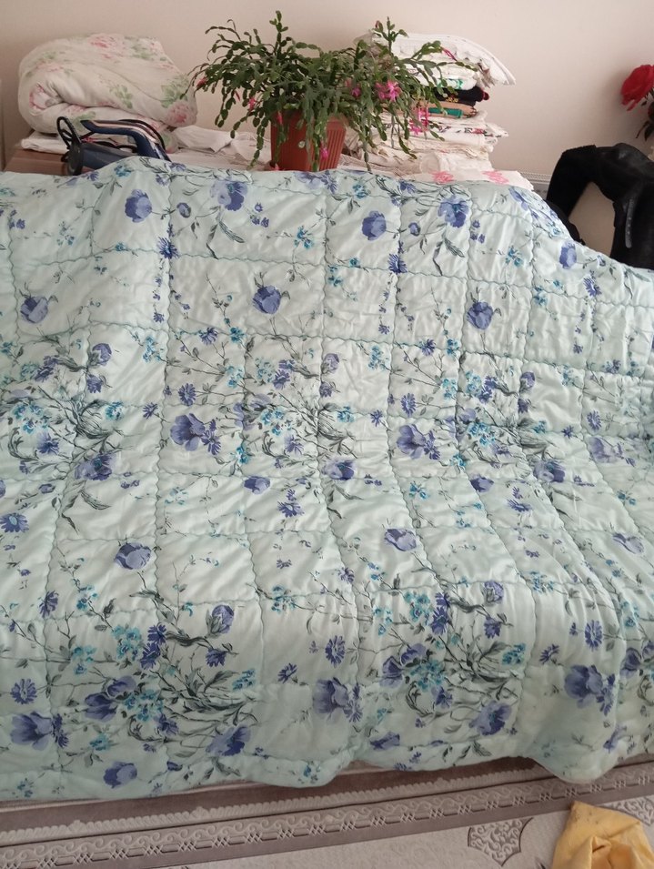Pastel mavi renkte, zarif çiçek desenli yorgan sfır ürün çift kişilik elde bağlama yorgan tam çeyizlik