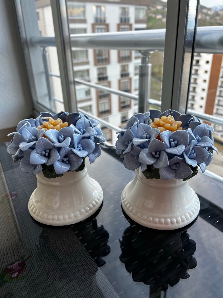 Beyaz tabanlı, pastel mavi çiçek desenli iki adet mumluk seti. Sarı detaylı çiçeklerle şık ve zarif bir görünüm sunar. ️
