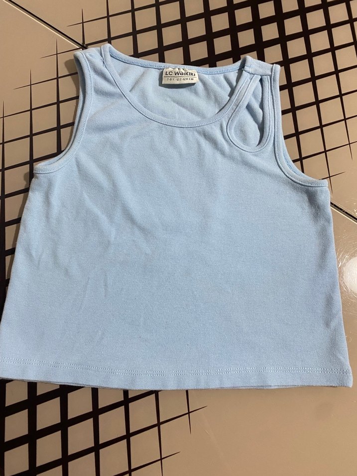 Pastel mavi renkte, yumuşak ve rahat kumaştan yapılmış, kolsuz çocuk atlet. Hareket kolaylığı sağlar.