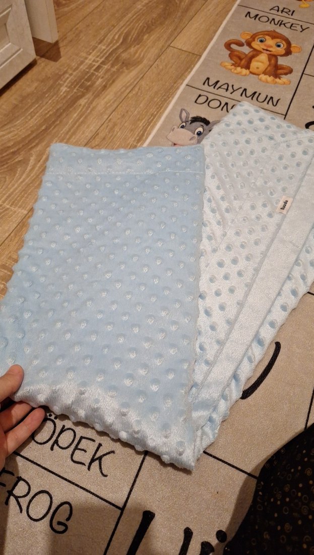 Pastel mavi renkte, kabartmalı nokta desenli sentetik kumaştan yapılmış yumuşak çocuk battaniyesi. Çocuklar için hafif sıcaklık ve konfor sağlar.