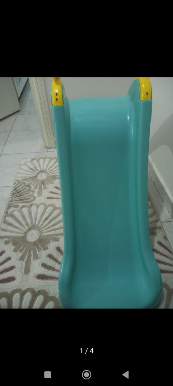 Pastel mavi renkli, sarı tutacaklı çocuk kaydırağı. İç mekanlarda güvenli oyun için uygun, pürüzsüz kenarlara sahip. kulp yeri vidalandı sağlam olsun diye gönderim esnasında sökülür paketin içine eklenir vidaları