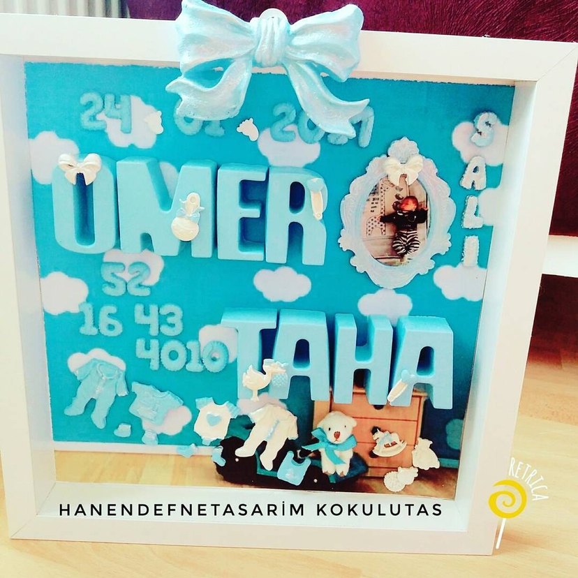 Pastel mavi renkte, harfli ve figürlü dekoratif çocuk rafı. 'TAHA' yazısı ve çeşitli süslemeler içerir. Özel tasarım ürün isme göre hazırlanır