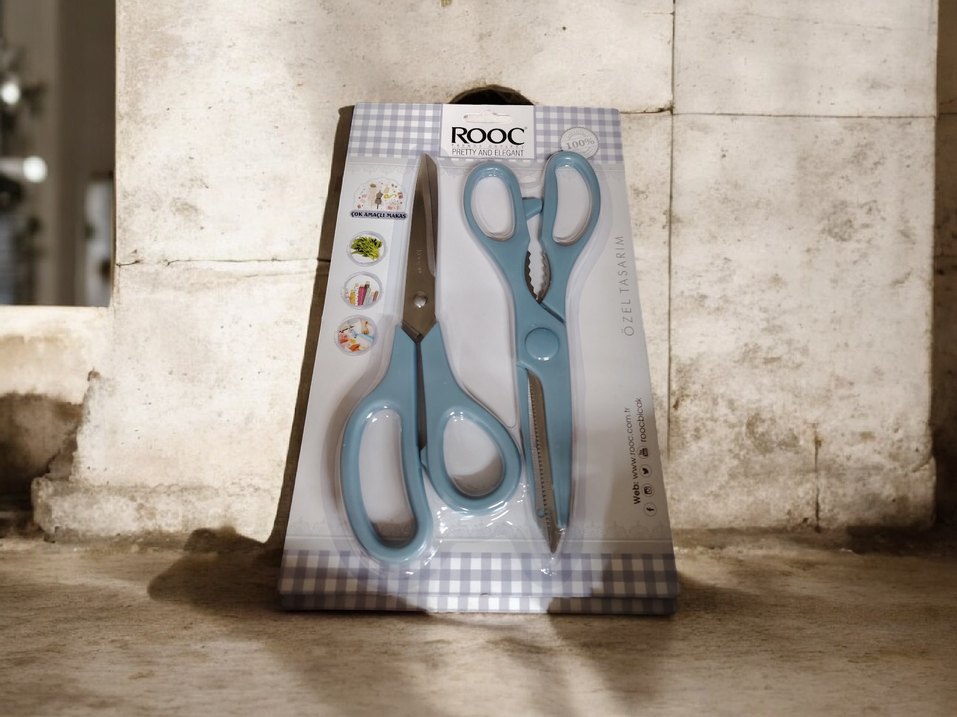 Ergonomik saplı, pastel mavi renkte iki adet çok amaçlı mutfak makası seti. Keskin bıçaklarıyla farklı mutfak işlerine uygun. ROOC markası. ✂️
