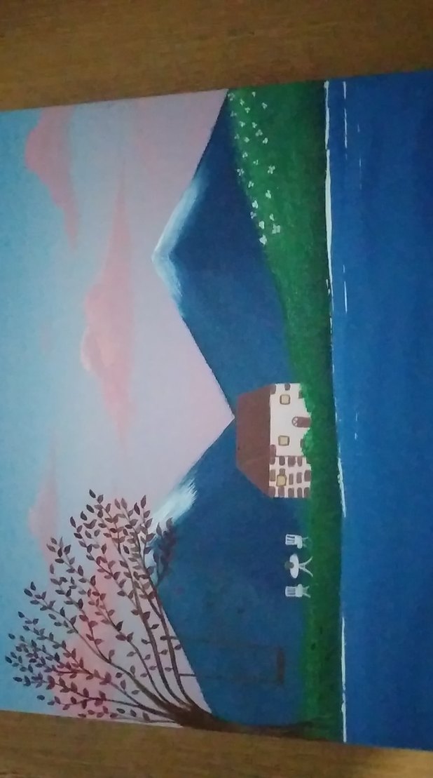 Pastel mavi tonlarda dağ, küçük bir ev ve ön planda bir ağaç içeren sakin bir manzara tablosu. Yumuşak renkler huzur veriyor.