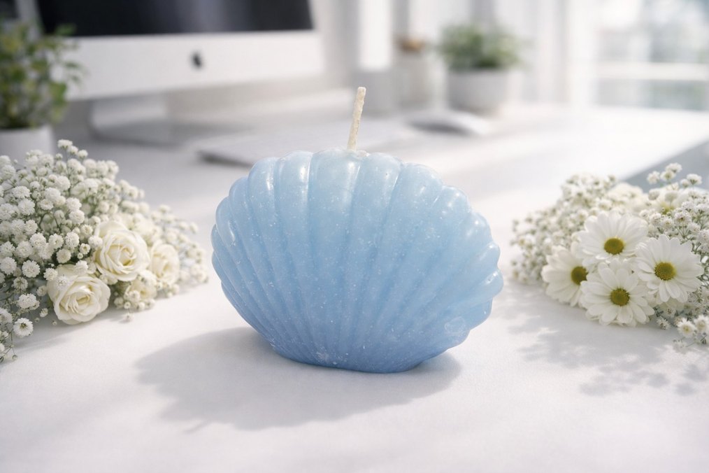 Pastel mavi renkte, deniz kabuğu şeklinde tasarlanmış mum. Yumuşak yüzeyi ve hafif parlaklığı ile sakinleştirici bir hava yaratır. Handmade