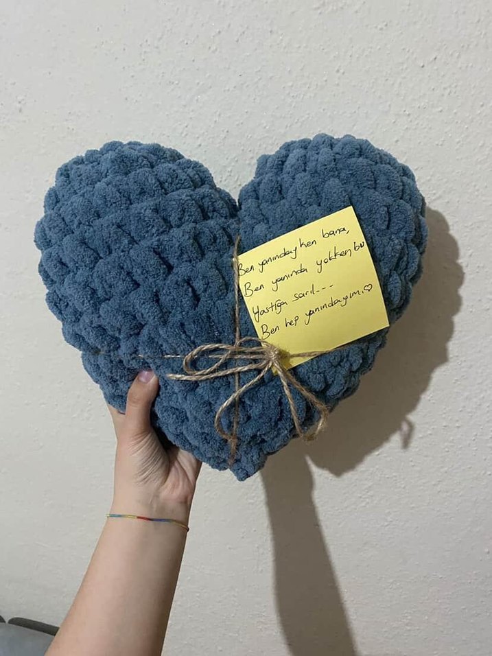 Pastel mavi kalp şeklinde, dokulu ve desenli yumuşak kumaştan yapılmış yastık. Rustik ip ile bağlanmış ve üzerinde not bulunur.
