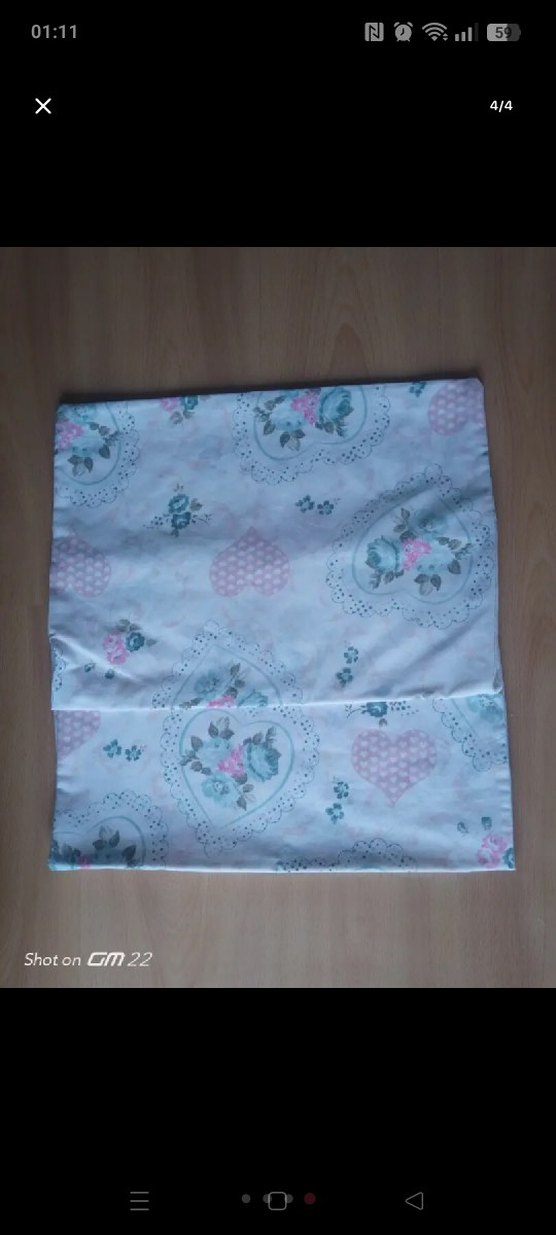 Pastel mavi renkli, çiçek ve kalp desenli baskılı yastık kılıfı, yumuşak ve zarif bir dokunuş sağlar.