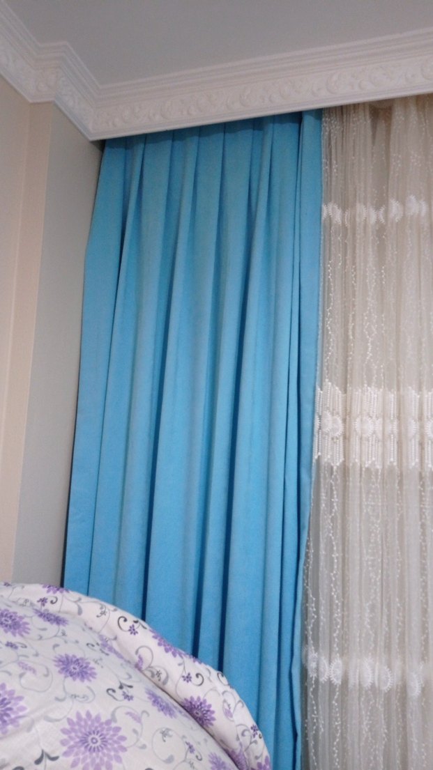 Pastel mavi renkte, düz ve klasik tarzda tasarlanmış perde, mekana sakin bir dokunuş katar. çift olarak bağlama kuşakları ile 85×270 ölçüde