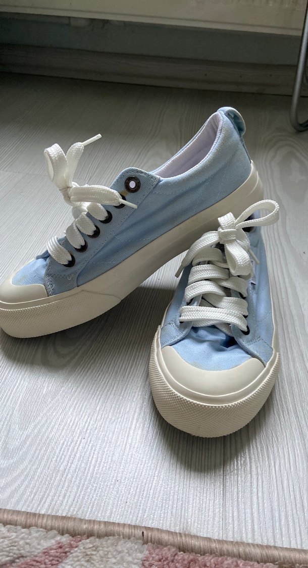 Kadınlar için pastel mavi renkte, düz tabanlı, kauçuk tabanlı spor ayakkabılar. Günlük kullanım için rahat ve şık sokak stili sneakers.