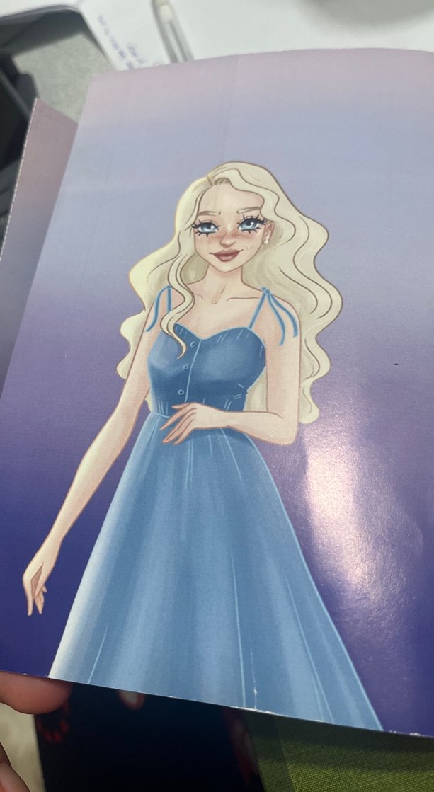 İnce askılı, düğmeli pastel mavi elbise giymiş, uzun sarı saçlı bir bebek. Elbise hafifçe dökümlü ve sade tasarımlı.