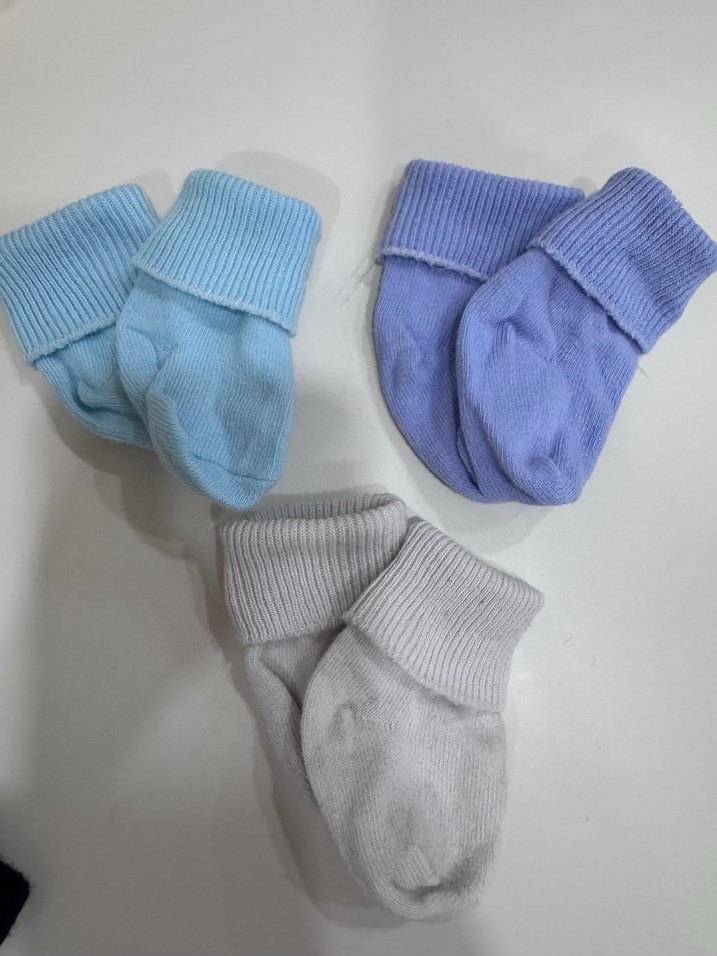 Pastel mavi tonlarda, yumuşak ve katlanabilir ribanalı 3 çift erkek bebek çorabı.