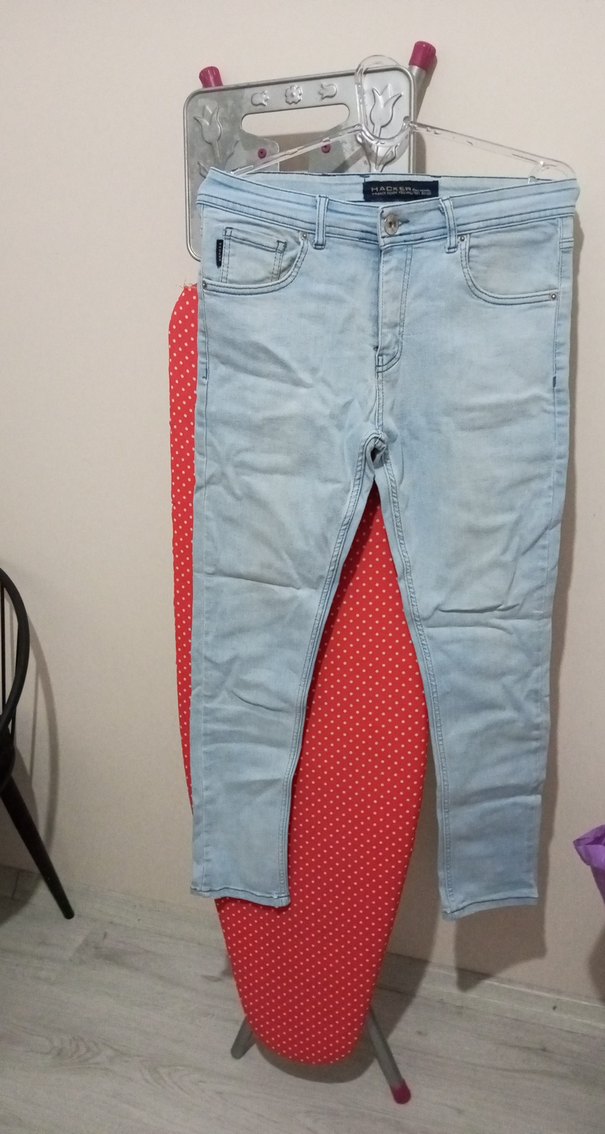 Pastel mavi renkte, düğmeli, normal boyda ve regular fit kesime sahip erkek denim pantolon. Günlük kullanım için uygun, rahat bir stil sunar.